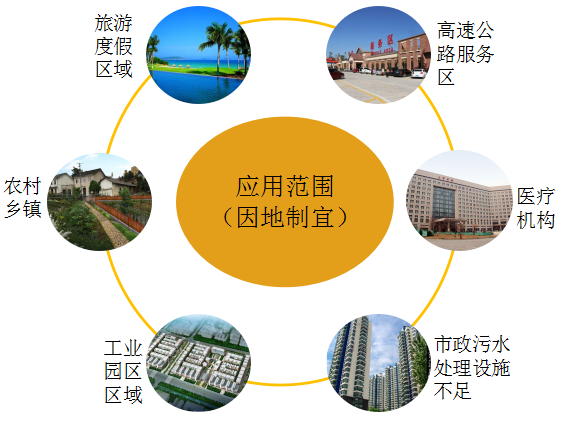 基于“ST-逆推式高效脱氧+好氧MBR”技术的智能景观一体化污水处理及回用设备应用广泛,可用于农村乡镇、工业园区、医疗机构、高速公路服务区、旅游度假区、市政污水处理设施不足的地方等。