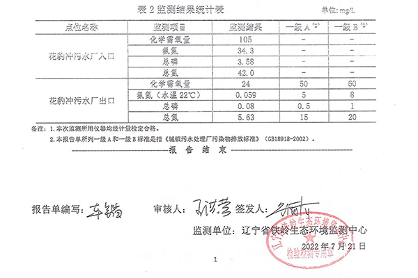 出水水质检测报告:COD浓度:21mg/L、氨氮浓度:1.35mg/L、总氮浓度:5.25mg/L