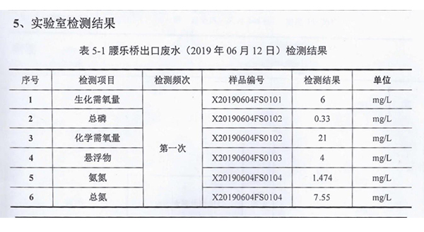 出水水质检测报告:COD浓度:24mg/L、氨氮浓度:0.059mg/L、总氮浓度:5.63mg/L