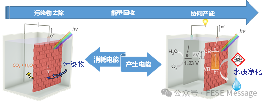 案例1污染物去除与同步产能。工业废水中往往含有多种具有较高价态的污染物,比如六价铬。在水处理过程中,需要将其还原为三价,即它可以接受3个电子变为低价态。因此,高价铬是一种富含能量的物质形态。为此,我们可以通过水处理电池系统设计,在铬去除的同时产生电能。如果有光的辅助,可使同步产能更加高效,光电除污产能系统如图2所示。
