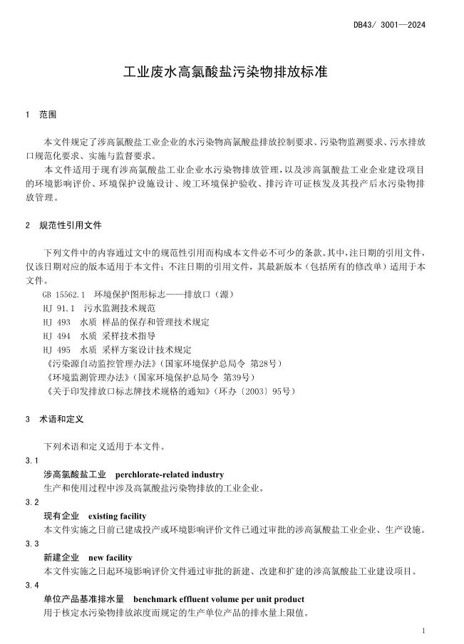 湖南省生态环境厅与省市场监督管理局近日联合发布了《工业废水高氯酸盐污染物排放标准》(DB43/ 3001—2024)(以下简称《标准》),自2024年10月1日起实施。
