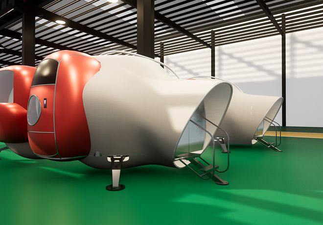 “瓢虫”本体选用轻质的充气膜,柔软的材料,在外观上具有亲和力;轻钢骨架底盘(方便安装运输),被四只仿生脚抬升到工作人员可方便采样的高度;双层充气膜被缝在金属弯管骨架上,方便快速搭建拆解回收。“瓢虫”的内设、家具均可配合使用者的活动折叠移动重构,提高空间灵活度。