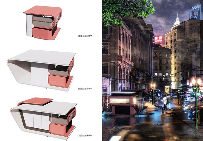 本设计能够在统一的一体式造型结构下实现A、B、C三种不同类型核酸采样亭变化的功能需求,同时灵活选择装配三种不同区域的核酸亭装配结构,使得核酸亭点位在转化功能时简易增加构件即可方便完成,提高核酸亭利用率,形成和谐统一的城市风貌。