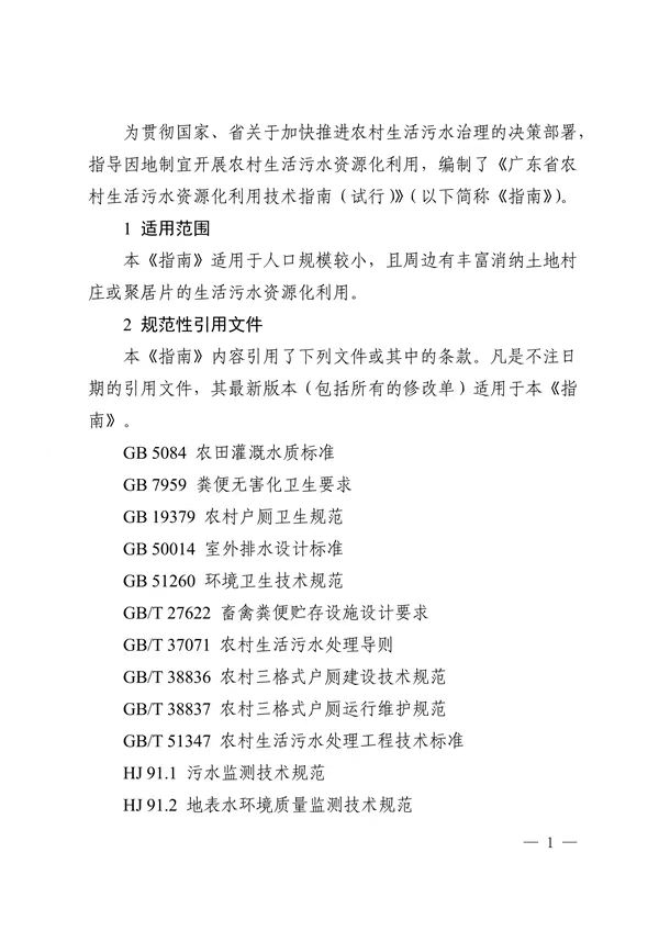 为深入贯彻国家和省关于全面实施乡村振兴战略、推进农村人居环境整治的决策部署,落实实施“百县千镇万村高质量发展工程”促进城乡区域协调发展的工作要求,因地制宜推进全省农村生活污水资源化与有效管控利用,广东省生态环境厅 广东省农业农村厅 广东省住房和城乡建设厅 广东省水利厅印发《广东省农村生活污水资源化利用技术指南(试行)》,全文如下: