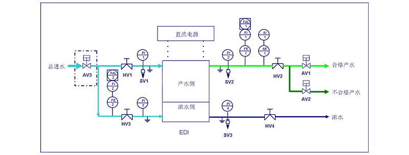 工作原理 EDI(Denationalization)又称连续电除盐技术,它科学地将电渗析技术和离子交换技术融为一体,通过阳、阴离子膜对阳、阴离子的选择透过作用以及离子交换树脂对水中离子的交换作用,在电场的作用下实现水中离子的定向迁移,从而达到水的深度净化除盐,并通过水电解产生的氢离子和氢氧根离子对装填树脂进行连续再生,因此EDI制水过程不需酸、碱化学药品再生即可连续制取高品质超纯水。