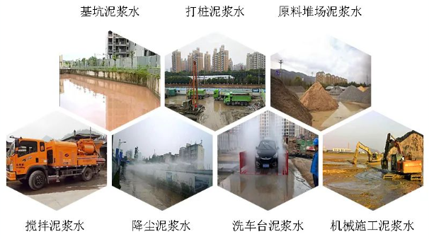 泥浆水种类包括:基坑泥浆水、打桩泥浆水、原料堆场泥浆水、搅拌泥浆水、降尘泥浆水、洗车台泥浆水和机械施工泥浆水等等。