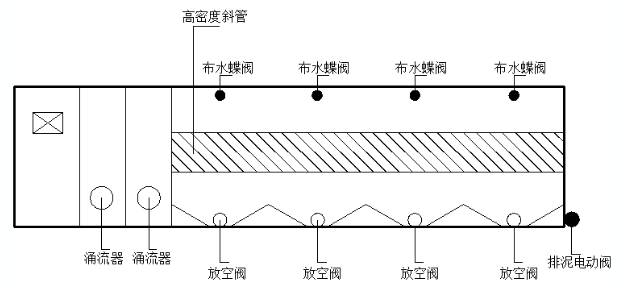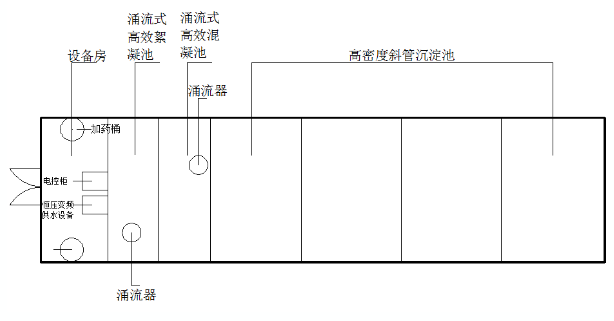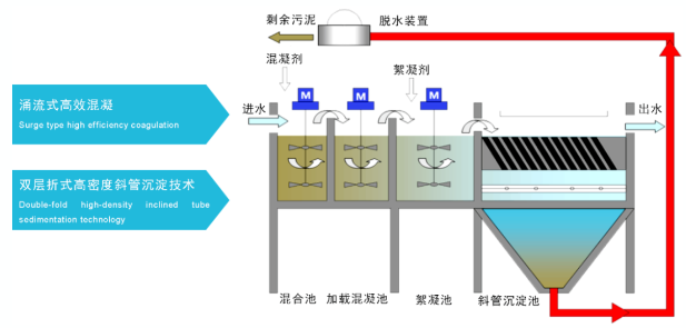 2、处理效率高:使用了涌流式高效混凝技术加快了反应速度,使用了高密度斜管沉淀技术大大提升了沉淀效率。