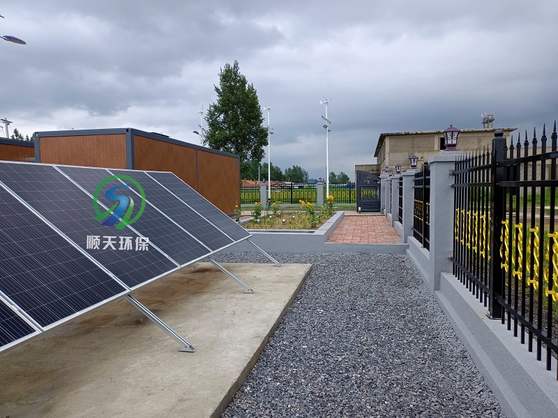逆推式高效脱氮+好氧MBR/人工湿地”工艺在非严寒低温气候时,启用“逆推式高效脱氮+好氧+竖流沉淀+人工湿地”工艺;在冬季严寒低温气候时,启用“逆推式高效脱氮+好氧MBR”工艺。该污水处理系统使用降低了运行能耗,实现污泥减量化并且减少碱量、碳源投放,节省运维费用,使分散性污水处理可以实现稳定达标排放,改善水体环境,拥有良好的环境效益。同时采用的智能生态光伏一体化污水处理装置的电路部分由太阳能光伏板、逆变器、三相交流电控制装置、应急备用市电网组成;使用清洁绿色能源,缓解了市政供电压力,最大化的利用太阳能能源。
