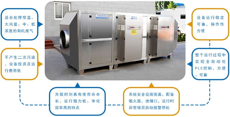 有机废气经收集后,在风机负压作用下进入活性炭吸附塔,由于固体表面上存在着未平衡饱和的分子力或化学键力,因此当此固体表面与气体接触时,就能吸引气体分子,使其浓集并保持在固体表面,利用固体表面的这种性质,当废气与大表面积的多孔性活性炭相接触,废气中的污染物被吸附在活性炭固体表面,从而与气体混合物分离,达到净化的目的。 技术特点